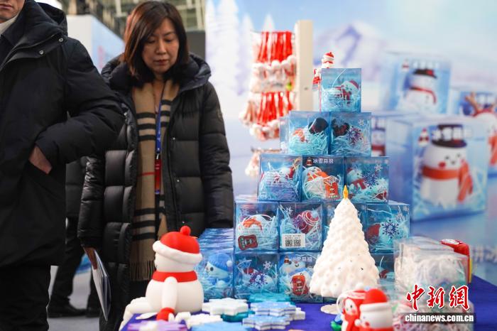 图为冰雪文创产物吸收不雅铺者。中新社记者 赵宇航 摄